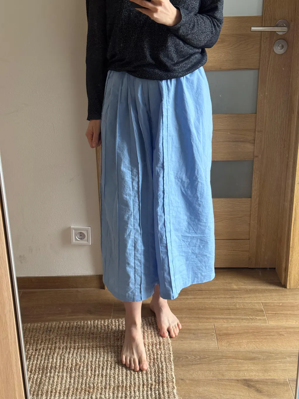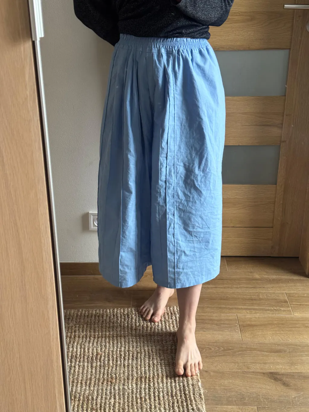 Because the skirt is composed of simple rectangles and has no lining, fabric choice plays a central role in shaping its personality. A structured fabric will highlight its clean, pencil-like lines, while a softer fabric will create a more relaxed, casual look. Even stable knits are possible, giving you a comfortable knit-skirt variation.