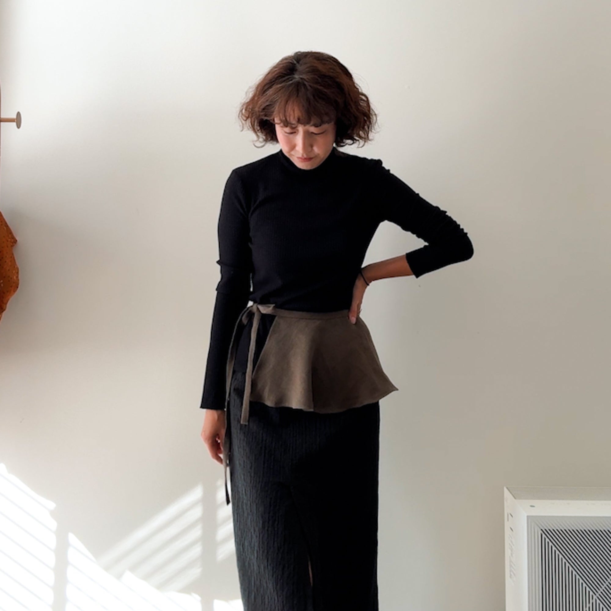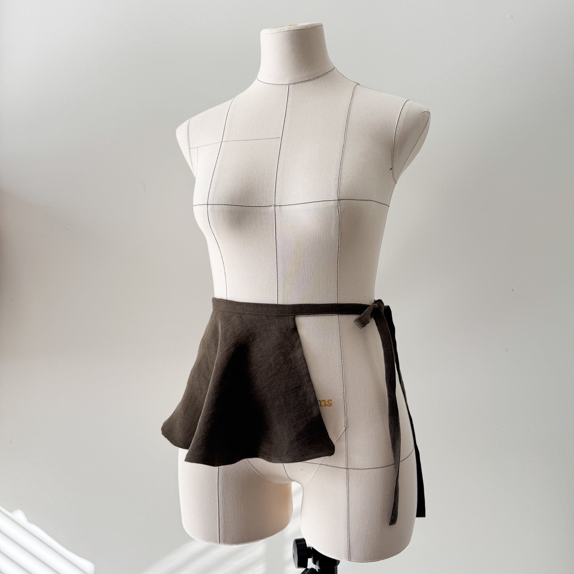 Cut on the bias for natural drape, it ties at the waist and flares gently away from the body, making it easy to style with dresses, skirts, or trousers. Depending on how it’s worn, it can create structure or offer soft movement.